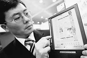 | 日前于北京舉行的第二屆中國數字出版博覽會上,工作人員在展示“電子紙”。范繼文