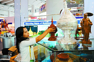 | 第五屆中國(guó)-東盟博覽會(huì)將于22日至25日在南寧舉辦,圖為來自泰國(guó)的一名客商在展位上布置參展的工藝品