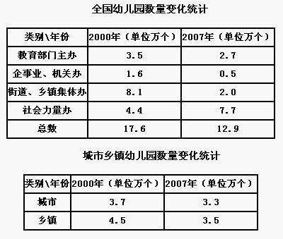 教育部門的統計數據清楚地顯示,從這一年開始,由于各種原因,我國幼兒園的數量在減少。據統計,2000年時教育部門主辦的幼兒園為3.5萬個,企事業、機關辦幼兒園為1.6萬個,街道鄉鎮等集體辦幼兒園為8.1萬個,社會力量辦園為4.4萬個;到了2007年,企業事業機關辦園和街道鄉鎮集體辦園急劇減少,分別下降為0.5萬個,2萬個,公辦幼兒園下降得緩慢些,變為2.7萬個,只有社會力量辦園增長較大,變為7.7萬個。但是總體數量從
