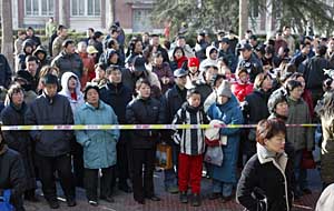 在北京某大學一考點外,許多家長在寒風中等待參加全國英語等級考試(PETS)的孩子。在此參加考試的考生絕大多數是中小學生。本報記者 羅偉