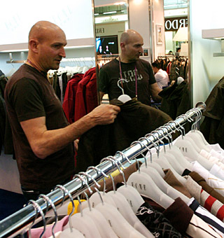 | 一位意大利采購(gòu)商在一家紡織企業(yè)設(shè)在廣交會(huì)的展位前選購(gòu)服裝。新華社記者
