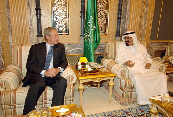 | 沙特國王阿卜杜拉(右)日前在利雅得與美國總統(tǒng)布什主要就加強雙邊關(guān)系和國際油價、伊朗核計劃等共同關(guān)心的熱點問題進行了探討。新華社/沙特通訊社 |