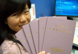7月3日,國旅總社的工作人員向記者展示臺灣游首發(fā)團游客的《大陸居民往來臺灣通行證》。目前大陸游客必須持有此證和相應簽注才能前往臺灣旅游。 大陸居民赴臺旅游首發(fā)團共有約760名團員將于7月4日搭乘首航兩岸周末包機,由北京、上海、南京、廈門、廣州五地陸續(xù)啟程。目前,相關旅游業(yè)者均表示已做好準備。新華社記者:張舵