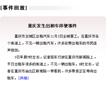| 11月3日發生的重慶出租車罷運事件可以說是近年來中國城市出租車行業利益紛爭的一個“標本”事件,雖在重慶市政府的介入下得到妥善處理,但由此暴露出的體制性痼疾我們必須高度重視。[詳情] | |