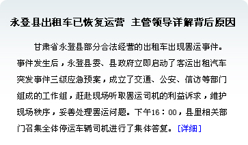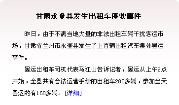 | 三亞和甘肅永登縣出租車司機罷運事件的發生不能說有偶然性,但是重慶出租車罷運事件的成功解決、司機合理權益的維護絕對起到了推動作用,推動了這矛盾的必然爆發。但是事件發生了,而且也很好的解決了,解決得令司機滿意,讓百姓放心,讓政府安心。這就產生了兩種不同的“示范效應”。[詳情] | |
