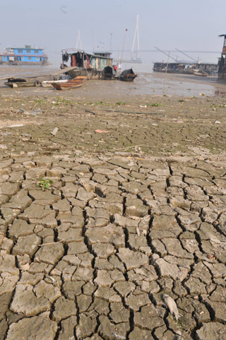 洞庭湖畔昔日碧波蕩漾的岳陽漁港碼頭成了爛泥塘。 |