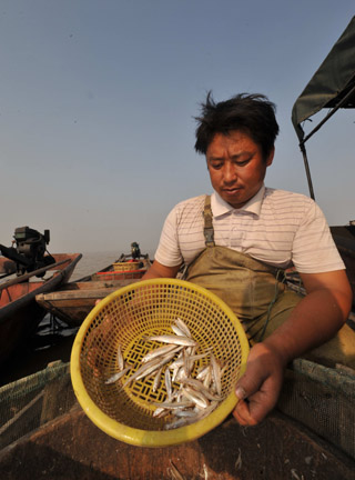 枯水使得洞庭湖的漁民每日只能捕撈到一點小魚蝦。 |