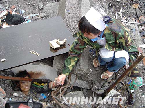 5月13日,一位護士不停地與一位被困孩子說話,鼓勵他等待救援。汶川地震造成四川北川縣老縣城80%、新縣城60%以上建筑垮塌,傷亡人數目前尚無準確統計。