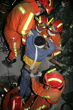 下午我們偶然發(fā)現(xiàn)縣委大樓底下還有生者,就集中力量救援,我們的生命探測(cè)儀發(fā)揮了重要作用,很快就確定了被救者的位置。幸存者是這個(gè)縣的政法委書記,由于他長(zhǎng)期在黑暗中見不到亮光,我們就一直用毛巾捂著他的眼睛,而他執(zhí)意要拿開我們放在他臉上的手巾,說要看我們一眼。我們告訴他,你不能看,見到光后你可能失明。他說,就是失明也要看看是誰救了我,我們堅(jiān)決不讓。他的眼睛保住了。我們真的很開心。 晚上回來的時(shí)候,吃上了方便面和大米粥,而且今天清水也送來了。大家4天來終于可以洗一次臉了。