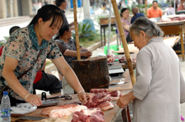 地震災(zāi)區(qū)農(nóng)貿(mào)市場(chǎng)供應(yīng)充足。圖為5月27日,四川平武縣一位老人在農(nóng)貿(mào)市場(chǎng)買肉。新華社記者:黃深鋼