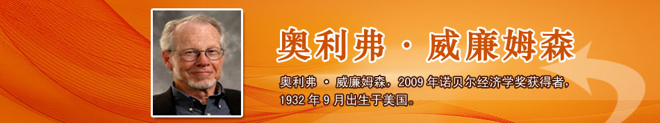 | 人物背景 | | 奧利弗威廉姆森(Oliver E.Williamson)1932年9月出生于美國威斯康星州。1955年畢業于麻省理工學院。1960年獲得斯坦福大學工商管理碩士學位。1963年獲得卡內基—德梅隆大學哲學博士學位。曾在賓夕法尼亞大學、耶魯大學任教。2009年獲諾貝爾經濟學獎。現任加州大學伯克利分校教授。(來源:加州大學伯克利分校網站等) | |